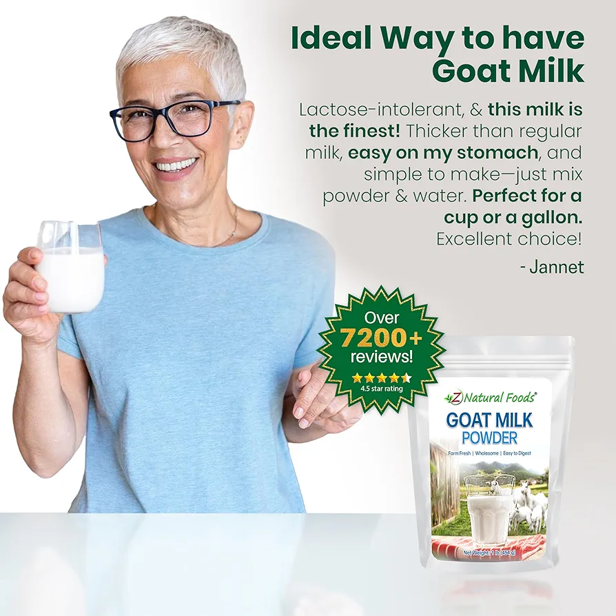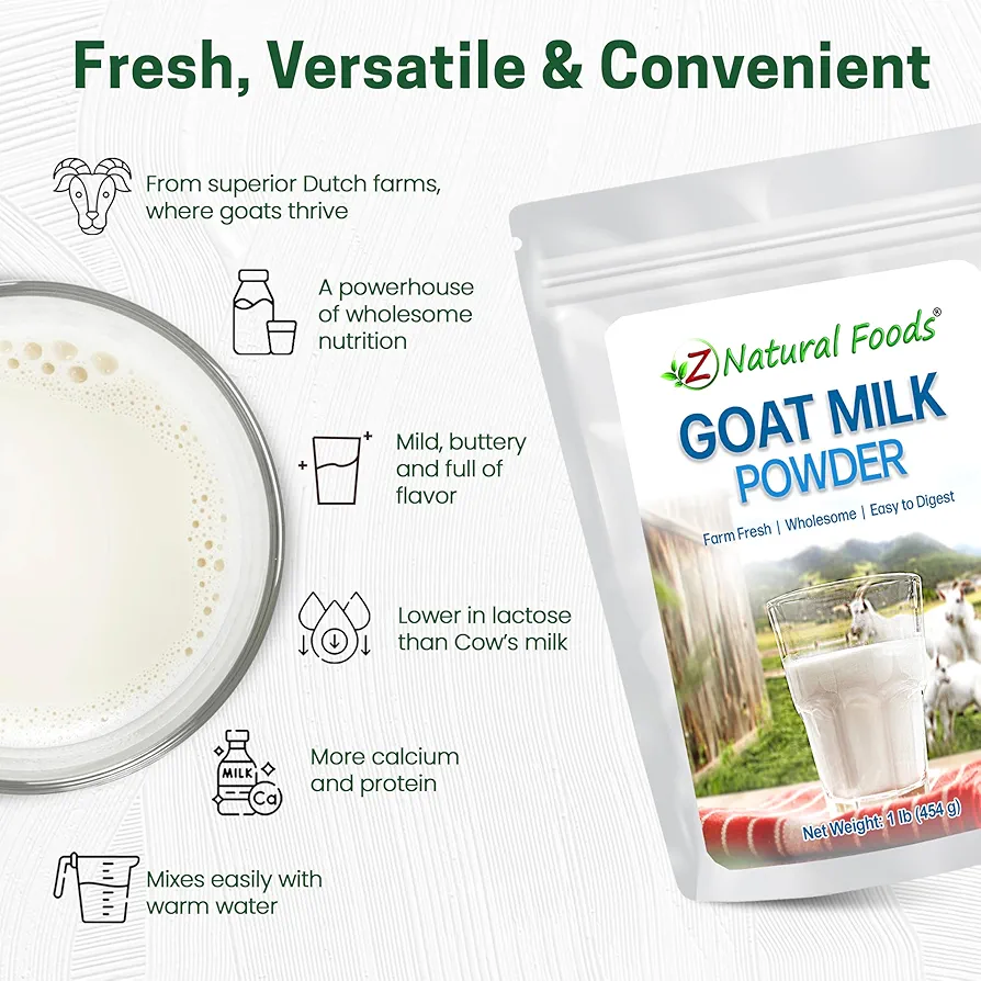 پودر شیر بز Z Natural Foods طعمی خامهای دارد که برای معده مناسب است و لاکتوز کمتری نسبت به شیر گاو معمولی دارد و انتخابی مناسب برای افرادی است که به لاکتوز حساسیت دارند یا معدههای حساسی دارند.