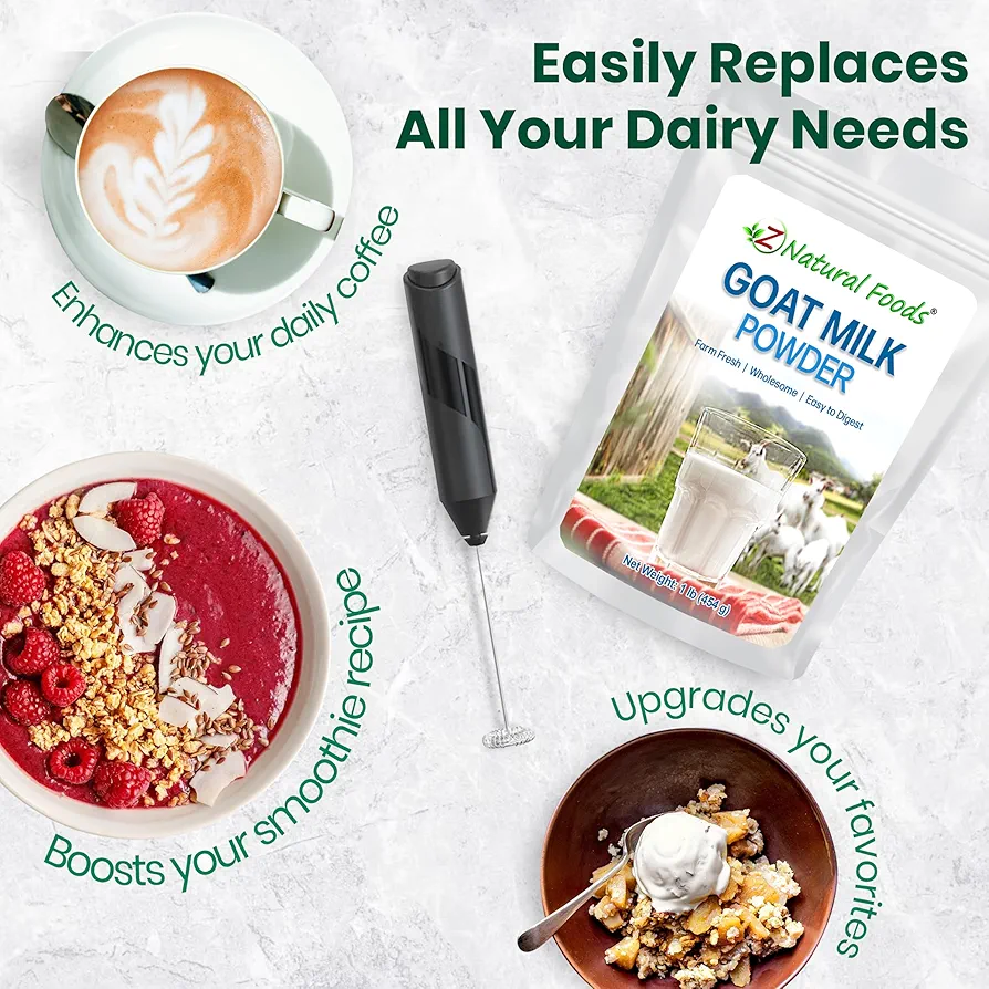 به راحتی ۴ قاشق غذاخوری پودر را با ۱ فنجان آب مخلوط کنید تا ۱ فنجان شیر بز خامهای و سرشار از مواد مغذی درست شود - عالی برای اسموتی، شیرینیپزی و آشپزی.