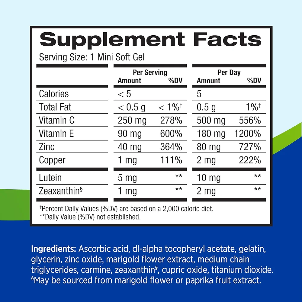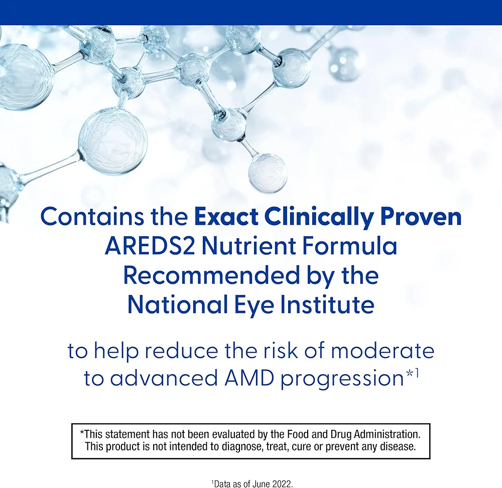 این فرمول شامل لوتئین، زآگزانتین، روی، مس، ویتامین C و ویتامین E است تا دقیقاً با فرمول مواد مغذی توصیه شده توسط متخصصان AMD در موسسه ملی چشم بر اساس مطالعه شماره ۲ بیماریهای چشمی مرتبط با سن مطابقت داشته باشد تا به کاهش خطر پیشرفت AMD متوسط تا پیشرفته کمک کند.